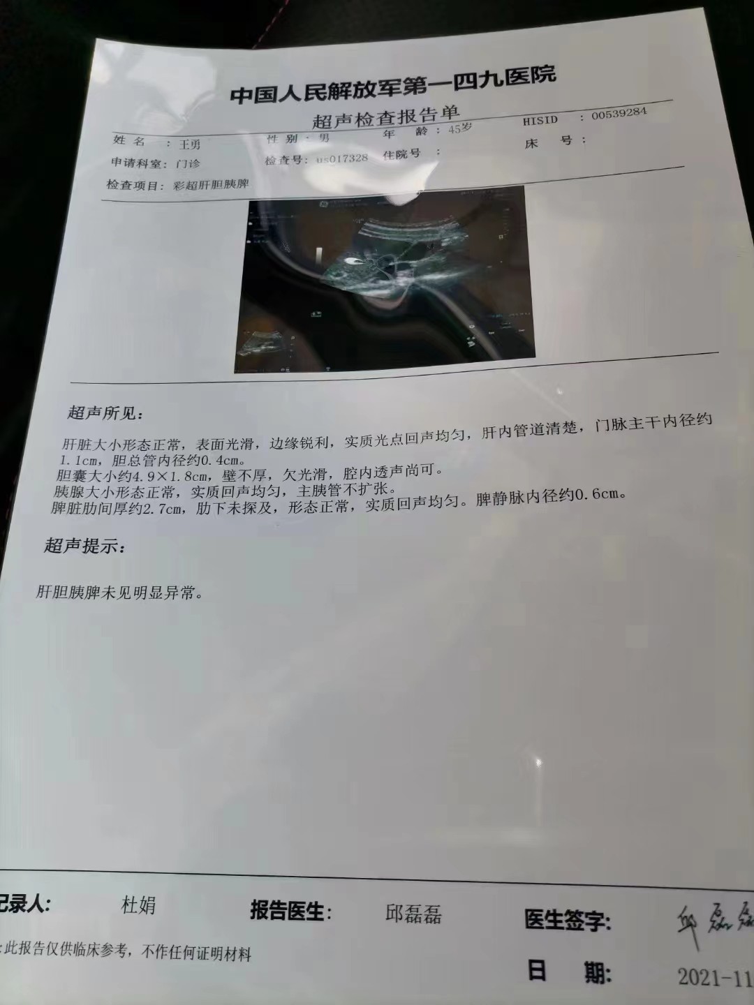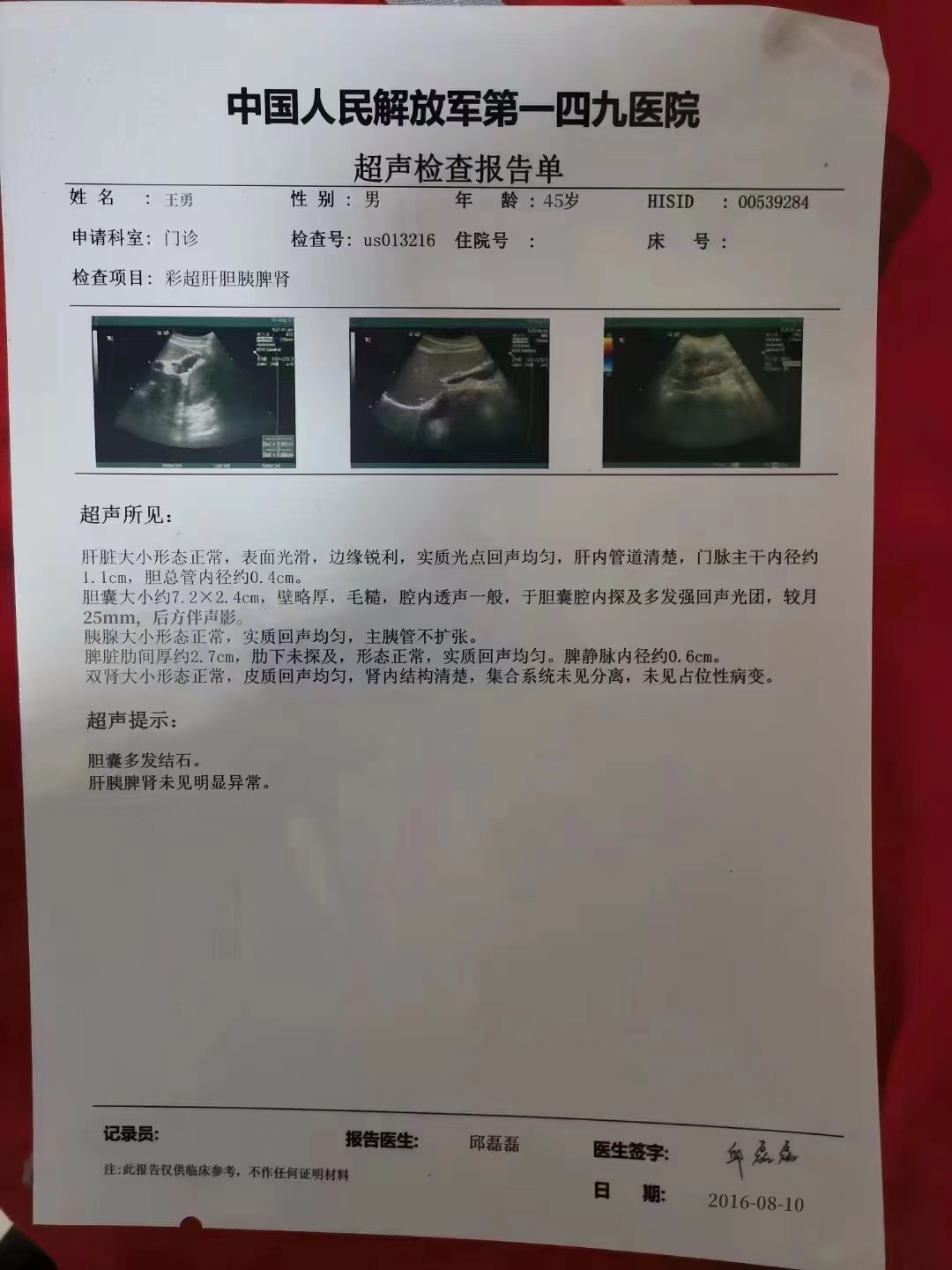但是说句心里话,我感觉还是有些不踏实,虽然我的胆结石这段时间来一直都没有犯过,B超检查报告也是排干净了,但我还是有些疑虑。怎么这样快就可以排出来了,而且还排得这样干干净净的。于是我就去了我们省内最大最权威的三甲医院又做了个B超,完了又千里迢迢去了趟北京,到国内最牛的医院——协和医院做了个检查,结果仍然都是没有胆结石。,当我看到我的报告时还是惊呆了!我的多发的胆管结石竟然在这样短的时间完全消失了!这下,我从心里彻底佩服了张主任,佩服他对我们这些患者的耐心咨询和指导,更佩服他家祖传排石液的神奇!